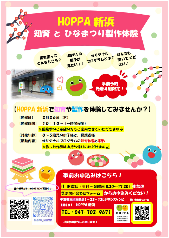 【千葉県市川市イベント情報】知育体験とひなまつり製作をしよう!【HOPPA新浜】