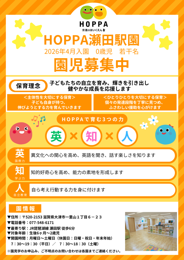 【滋賀県大津市】令和8年度 0歳児 園児募集について【HOPPA瀬田駅園】