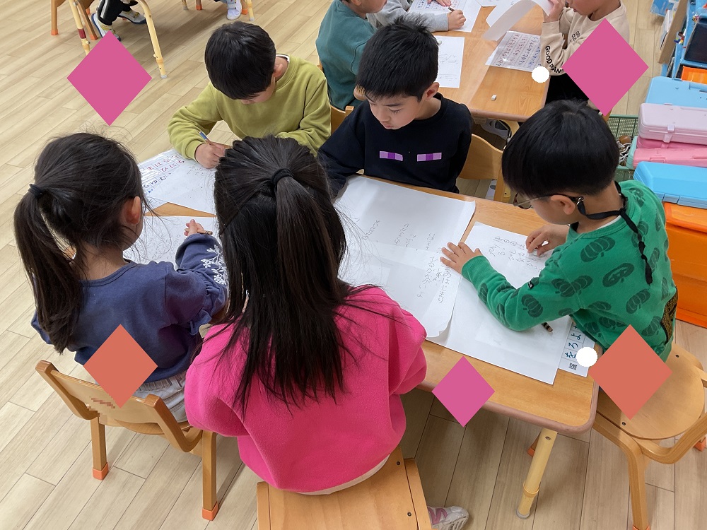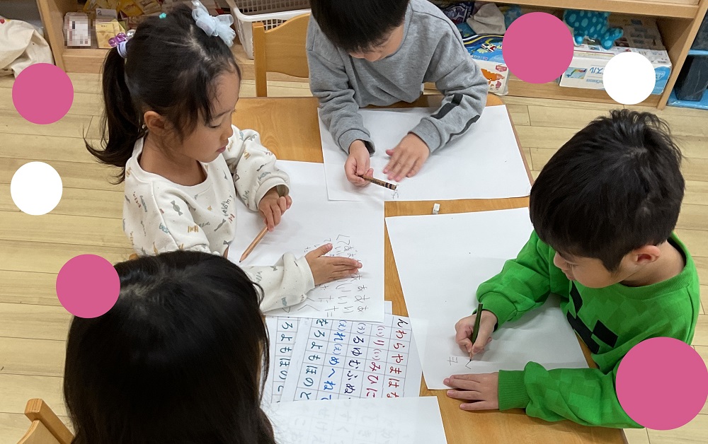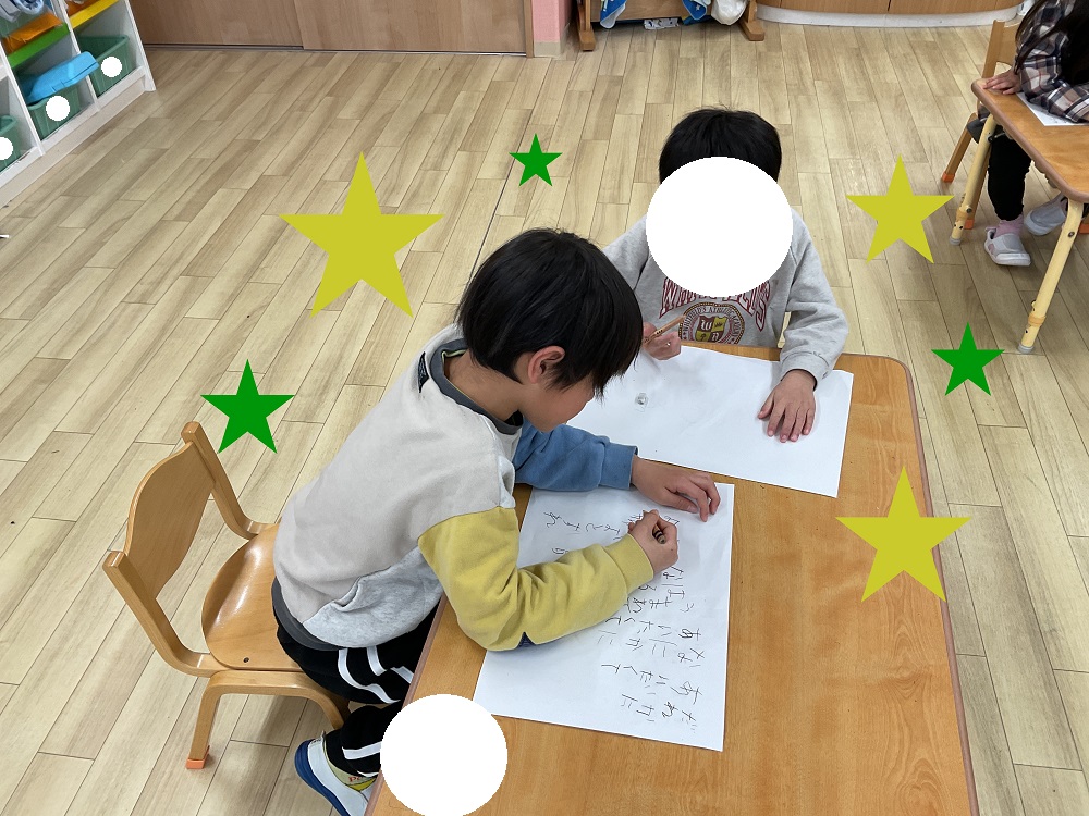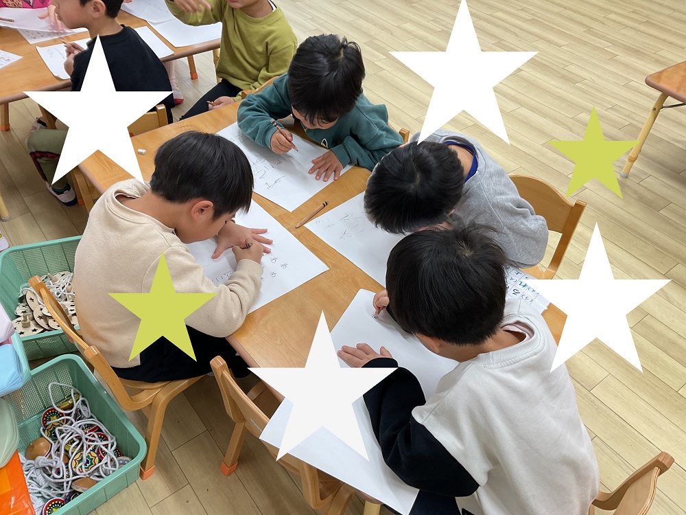 毎日、知育timeや、他のクラスのお昼寝の時間、外で遊ぶ時間と製作の時間をみんなで話し合って工夫し、書いて練習する時間を作っています。