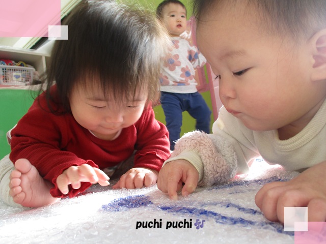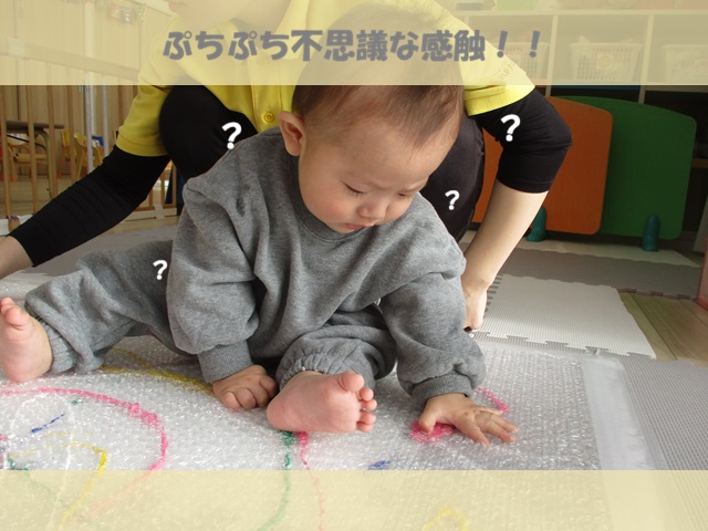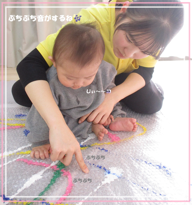 保育士がつぶしたぷちぷちの音に気付き、同じようにふくらみを見つけて指でつぶして、『プチっ!』の感触と音を楽しんでいます!