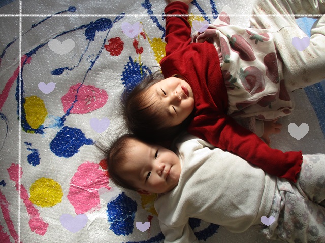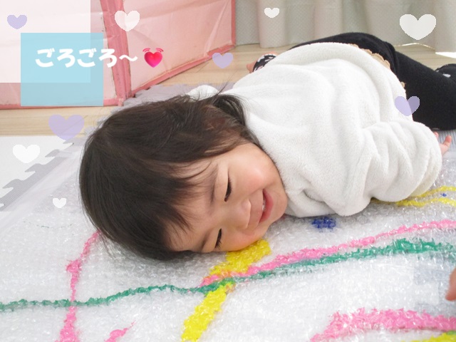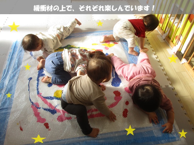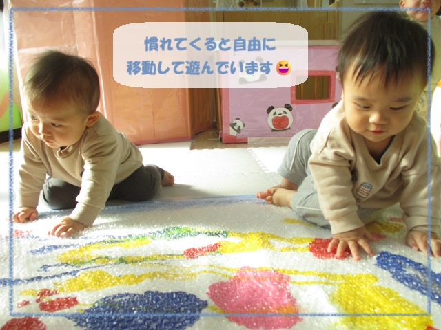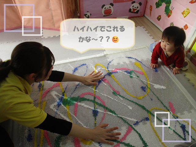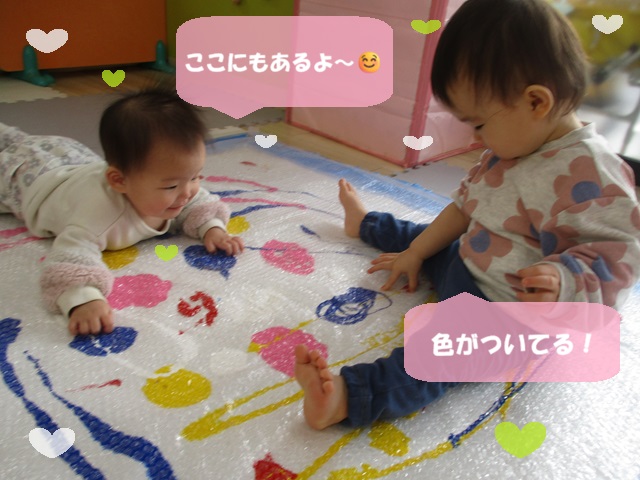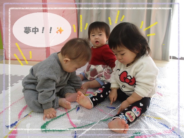 緩衝材の下の絵具にも気づき、これも指で潰したり、なぞってみたりと沢山触れて、それぞれ遊んでいます🌞