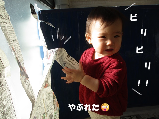 部屋の床や壁一面に貼ってある新聞紙をみんなでビリビリ!!!