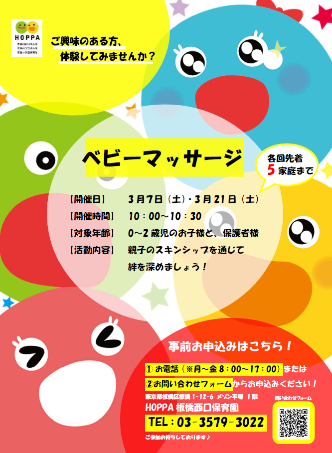 【東京都板橋区イベント情報】ベビーマッサージ開催!【HOPPA板橋西口保育園】