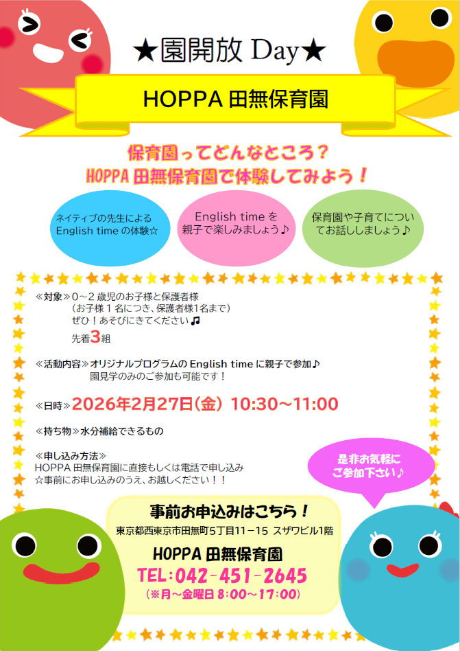【西東京市イベント情報】English timeを体験しよう!【HOPPA田無保育園】