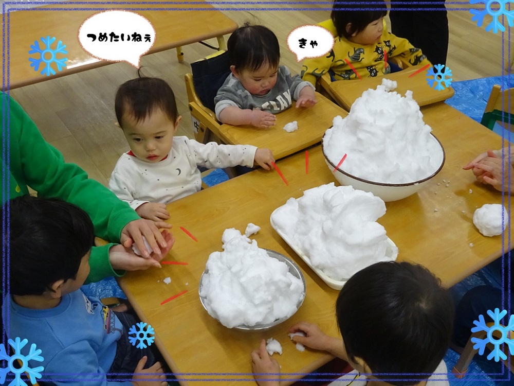 外のきれいな雪をそっと持ってきて、保育室で雪遊び開始★