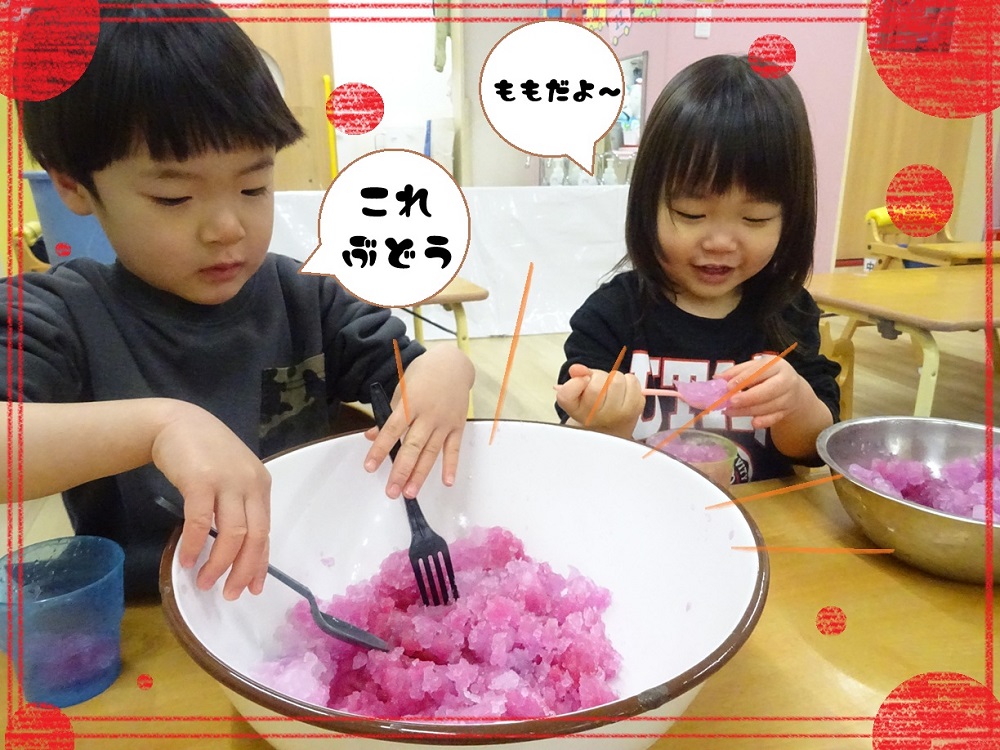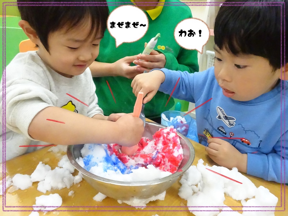 色が広がる様子をじっと見つめたり、指でそっと触れて感触を確かめたり、それぞれが雪の変化を楽しんでいましたよ⛄