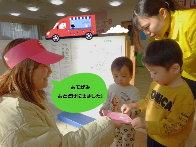 「HOPPA中広園の子どもたち宛にお手紙お届けに来ました!」と言われ、お当番の子どもたちが受け取りに来てくれました😁