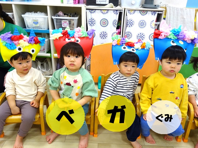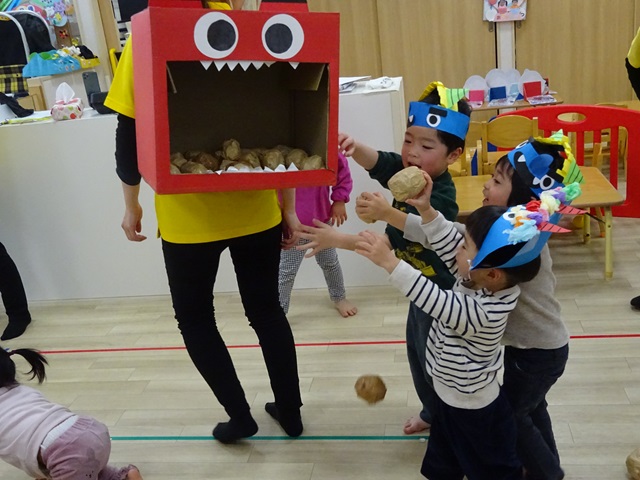「みんなのお腹の中にも鬼がいるかな~?みんなのお腹の中にいる鬼も退治しよう!」という事で、新聞紙で作った手作りの豆で豆まきを行うことに★