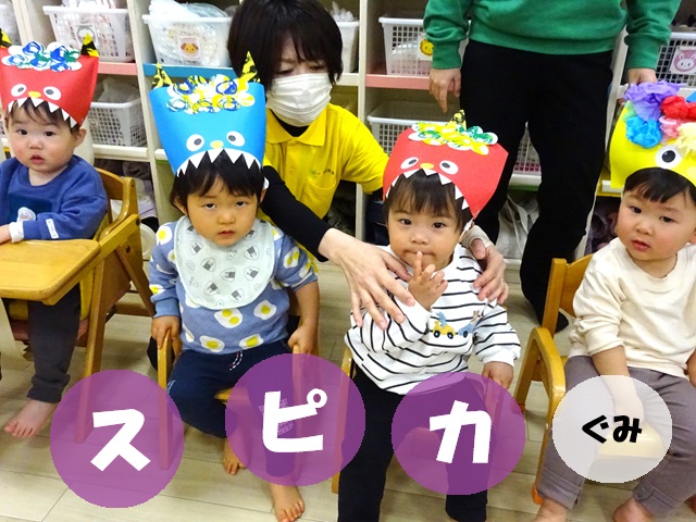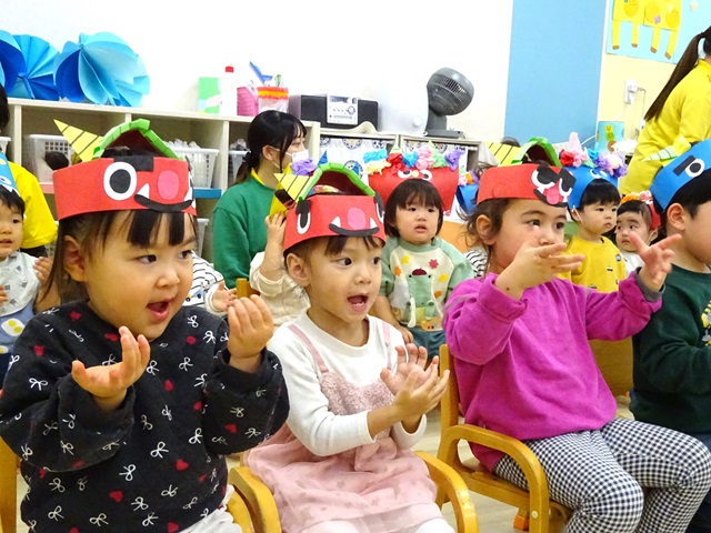 各クラス、手作りの鬼の帽子を被って「はい、ポーズ💛」