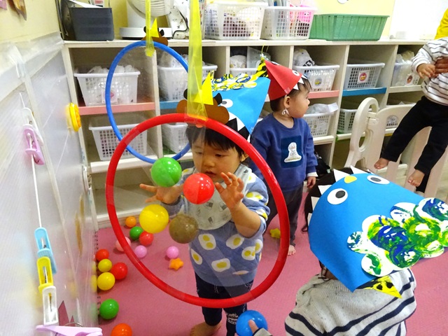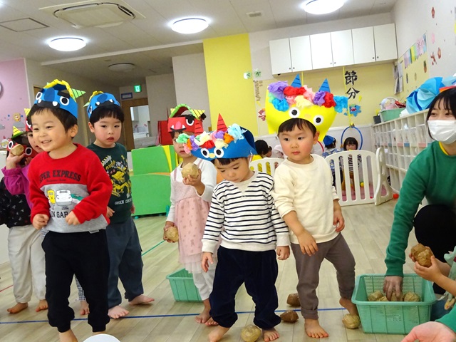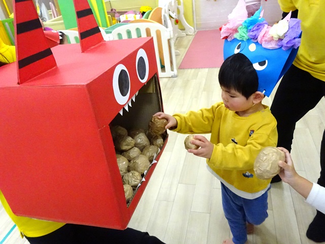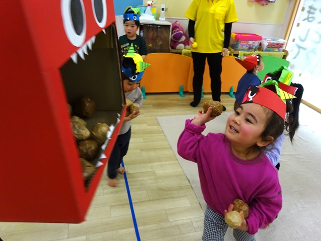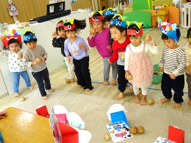 シリウス組(2歳児クラス)の子どもたちに色塗りをしてもらった鬼の絵をめがけて、豆を投げます。