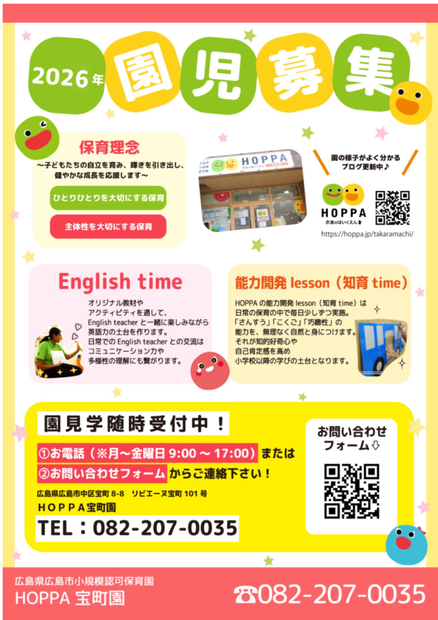 広島市中区にあるHOPPA宝町園は、2026年4月入園の園児募集を行っています。