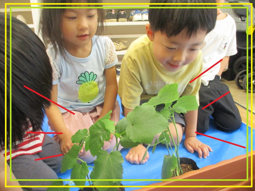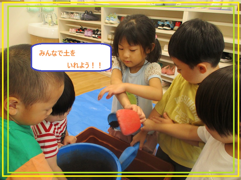カペラ組(3歳児)はトマト、4歳児(ベガ組)はオクラ、5歳児(シリウス組)はキュウリを植えました。