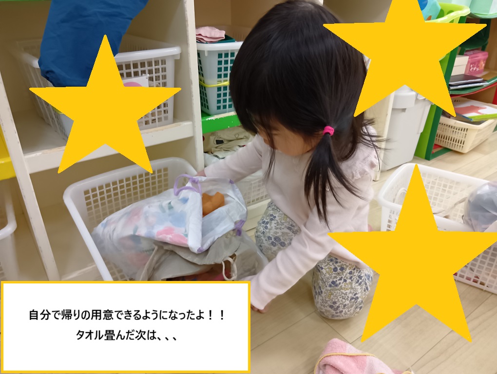 生活面では、「自分で」衣服の着脱はもちろんのこと、脱いだ衣服を畳み、ロッカーに片付け、帰りの支度もひとりできるようになってきたシリウス組さん。
