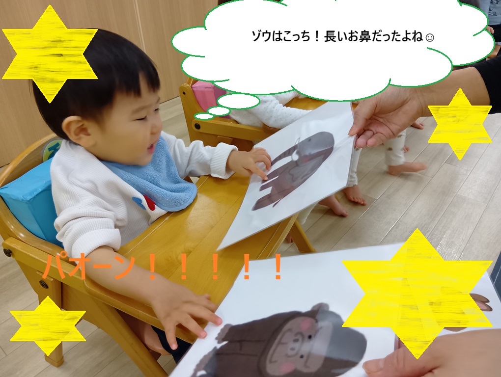絵本や歌に出てくる動物に興味を持つようになり、「動物どっちかな」のクイズでは先生が伝えた動物のカードを見比べて選んでタッチすることができるようになりました。