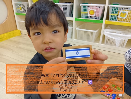 また、国旗のブロックにも興味をもち、国旗カードではしていない国も覚えられるようになりました。