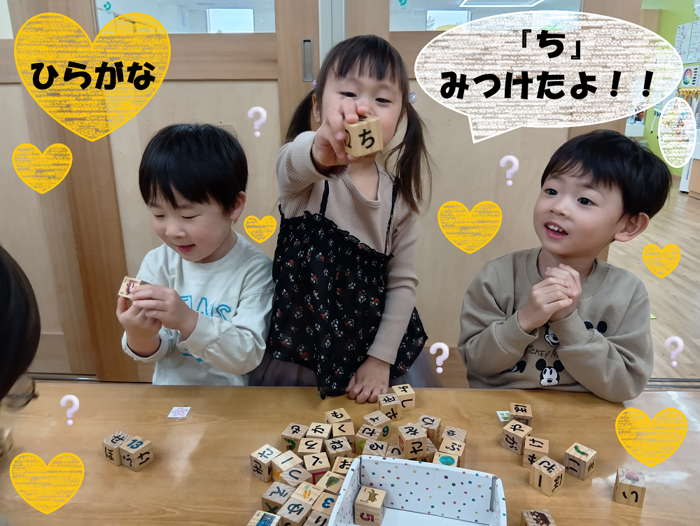 遊びの中でも、ひらがなブロックを使って「自分の名前探し」を楽しんでいます!