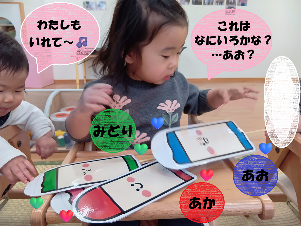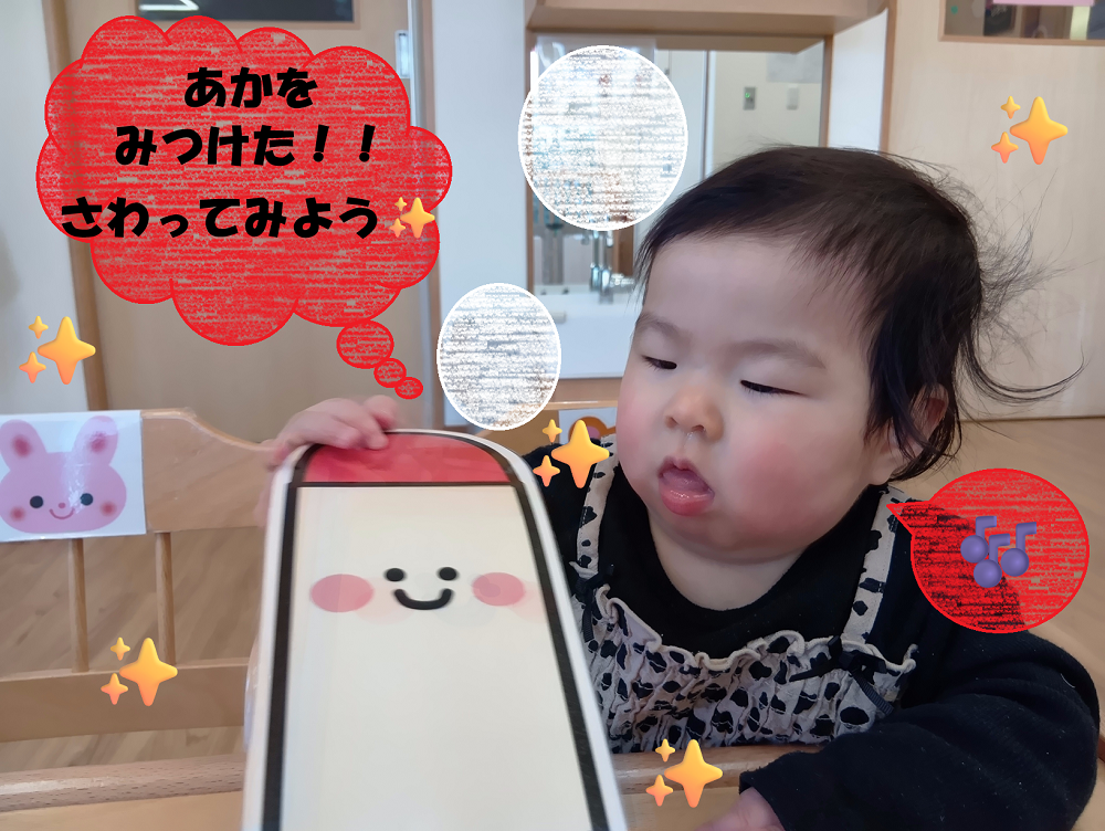歌を通して色の種類を知り、同じ色の物を探してみたり、絵本では『だるまさんが』に登場してくるだるまさんの真似をしたりして、楽しみながら多くのことを吸収して成長していく姿が見られました✨