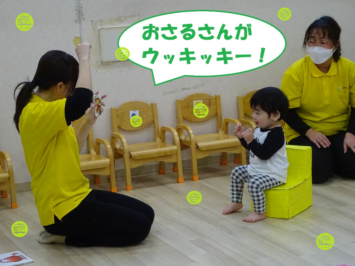 スピカ組(0歳児)さんの発表では、しっかり椅子に一人で座り、大好きな動物さんを見つけたり真似をしたり、とっても可愛らしい姿にみんなほっこり💛