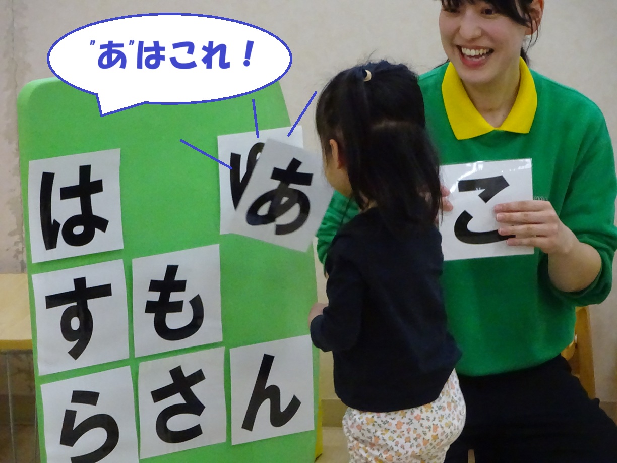 ベガ組(1歳児)さんは、お友だちや自分の名前に使われているひらがなを見つけました。