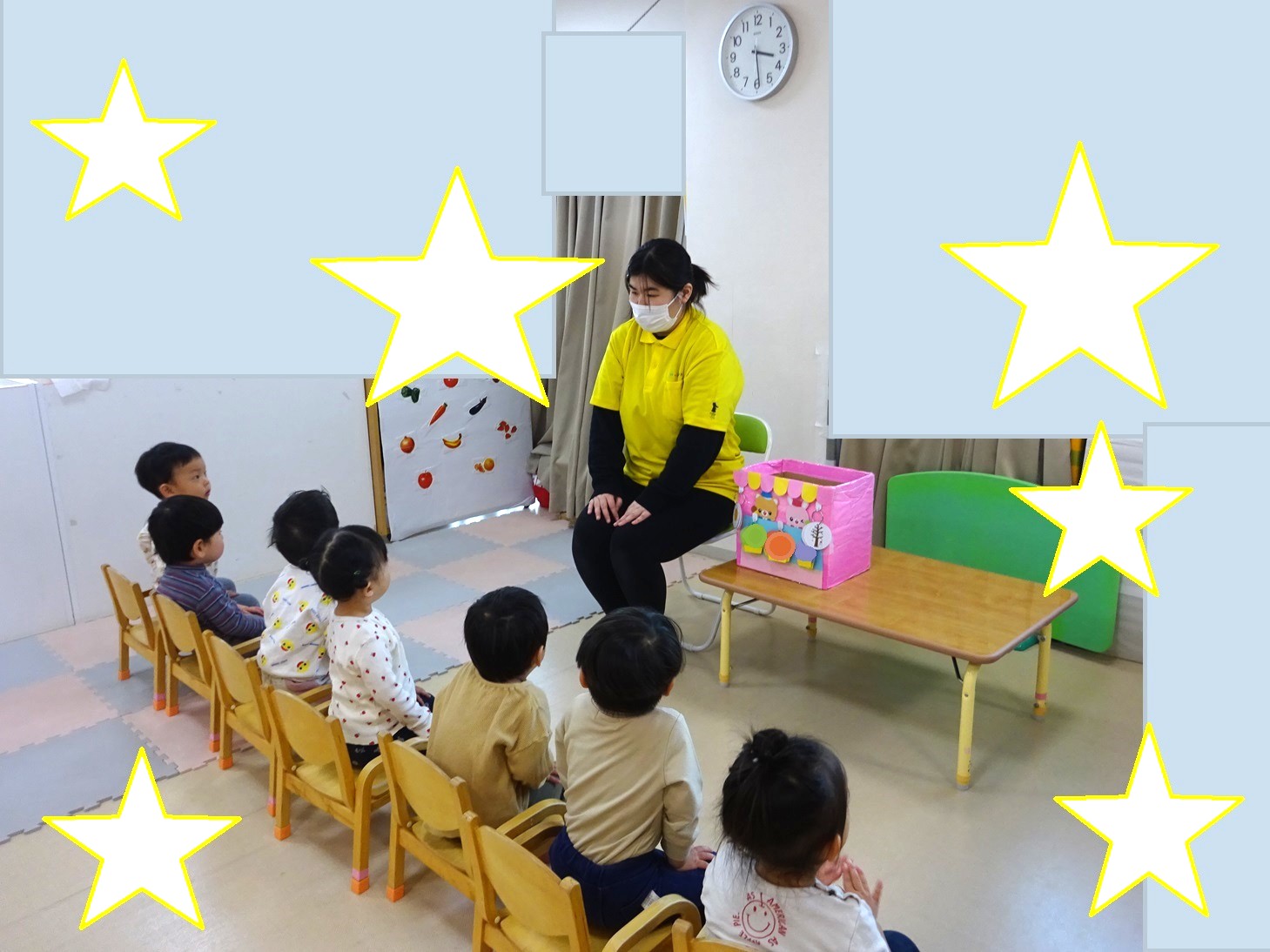 1年間の知育timeを通して、季節の言葉カード、季節の歌、ひらがな、すうじ、果物、野菜、動物、乗り物、暦、色、方向、多い少ない、順序、形、国旗、ことわざなどの様々な体験をしてきました。