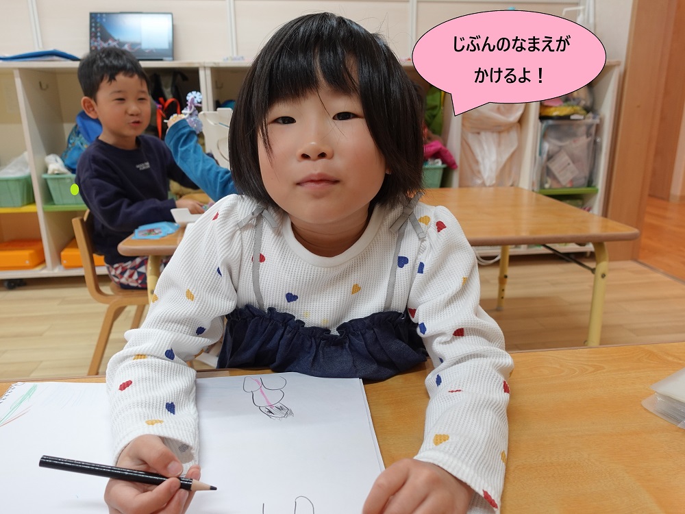 また、自由遊びの際には知育timeで取り組んでいるひらがなを使い、お友だちの名前を書いたり、簡単な単語を描いて楽しむ姿が見られるようになりました。