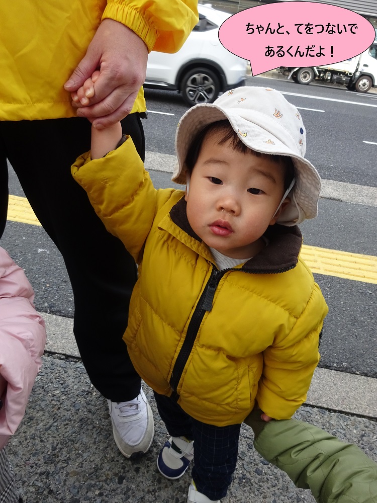 手を繋ぐ・前の人と間隔をあけないなどお散歩のときの安全ルールを守りながら歩いていますよ!