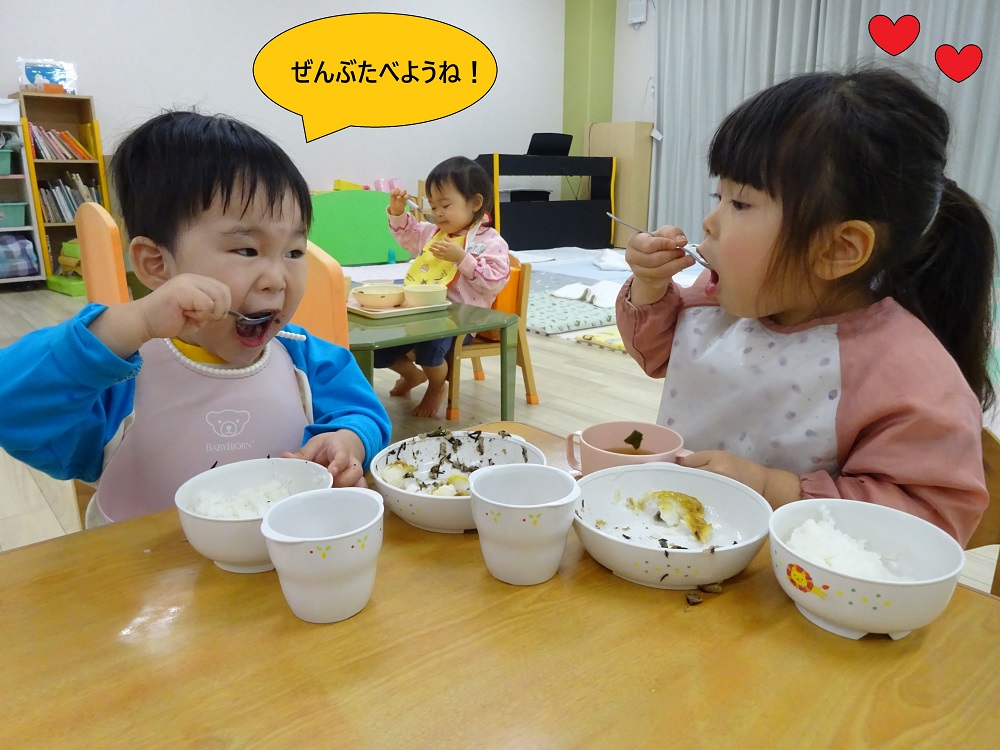 ご飯やおやつでは、食べ慣れないもの・苦手な食べ物は食べようとしなかった子どもたちも、今では一口挑戦してみたり、「ぴかぴかなったよ!」と嬉しそうに空っぽの食器を見せてくれたりして、色々な姿を見せてくれます!