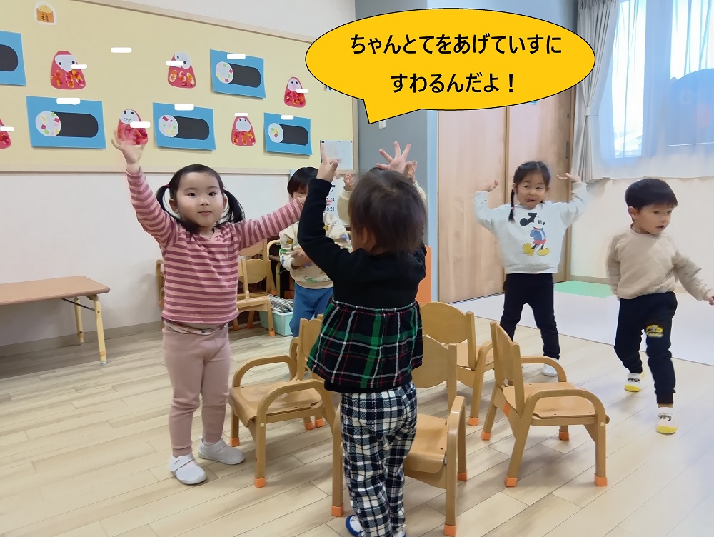 簡単なルールのある遊びができるようになり、椅子取りゲームやだるまさんがころんだなどを取り入れながら楽しんでいます!