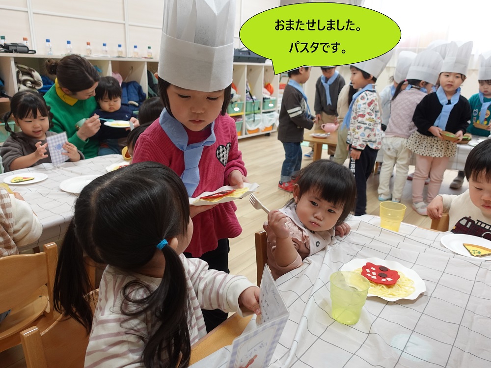 また、お部屋に乳児さんを招待してレストランごっこでもてなすなど、幼児クラスのお兄さん・お姉さんにも挑戦です!