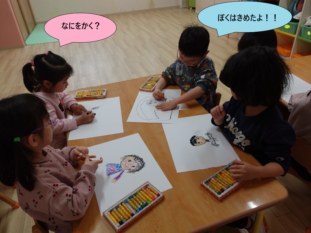 はじめは「何をどうしたらいいのか分からない」という様子で、お友だちの真似をしたり、まったく違うものを描いたりしていた子どもたち。