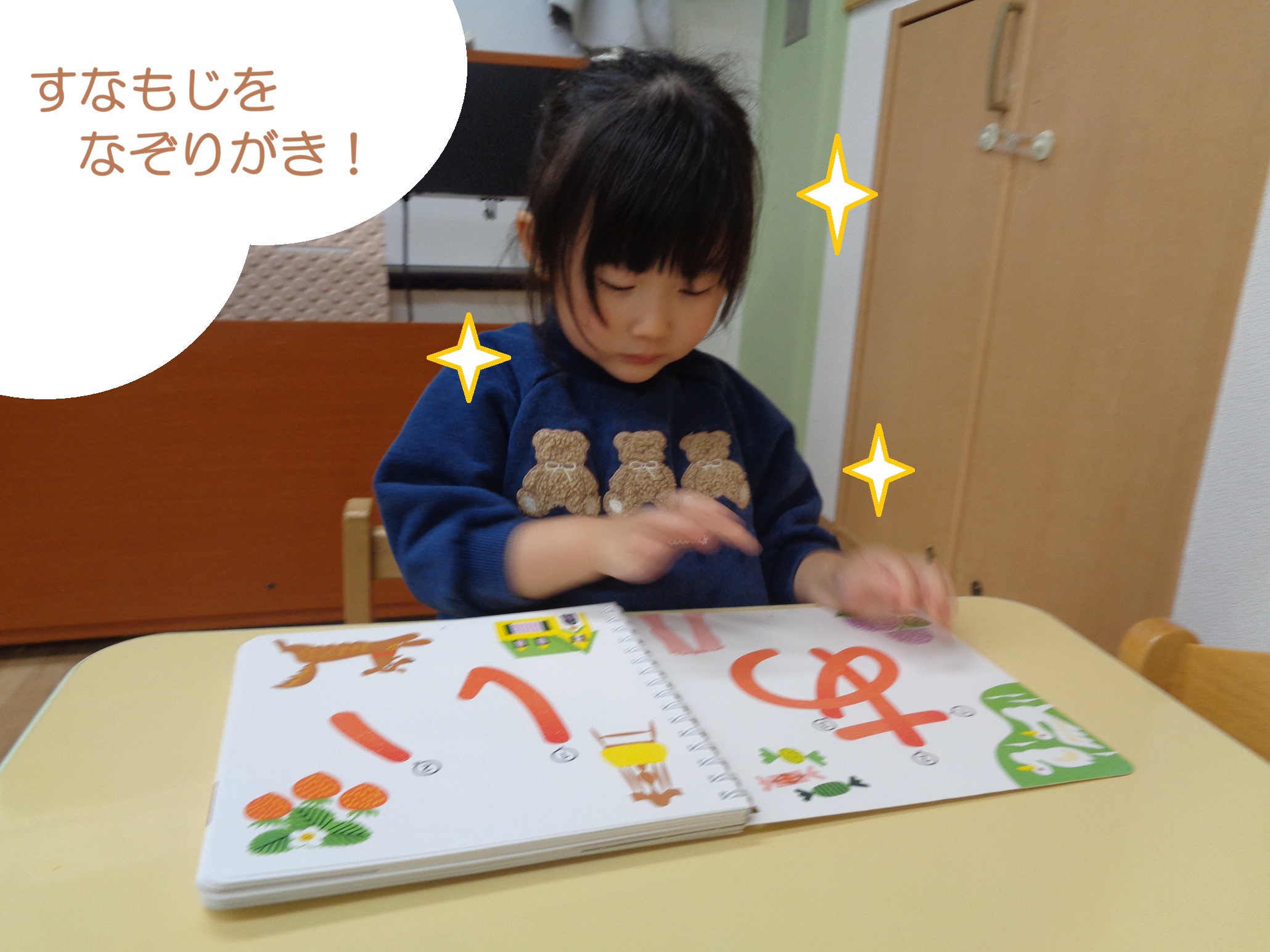 遊びの中や絵本、散歩中に見かける看板など、様々な場所でひらがなやアルファベット、数字を目にする機会の中で、発見を喜びあったり、自分で文字を読んでみる子どもたち!