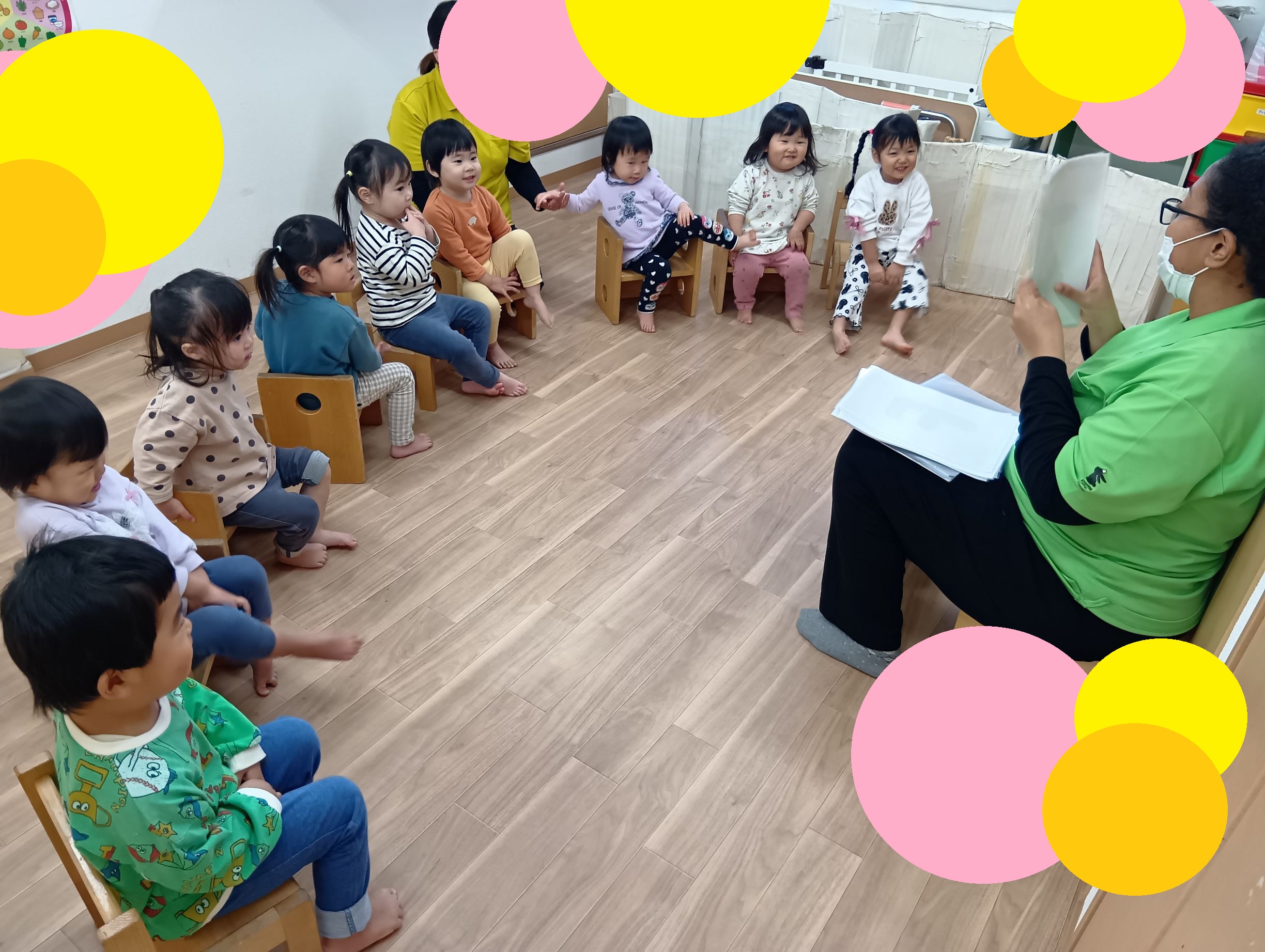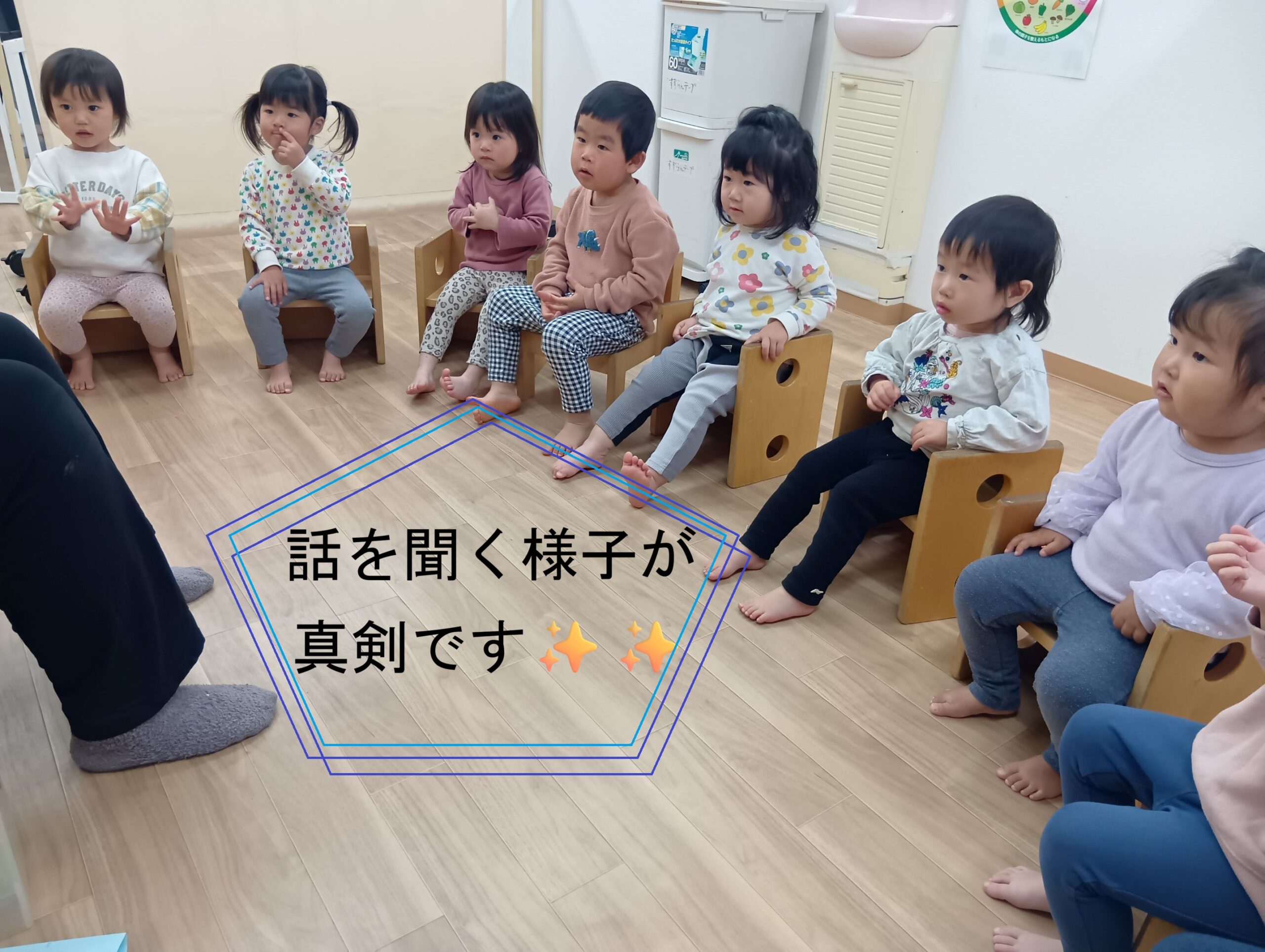 今ではみんなで椅子に座って楽しんでいるベガ組の子どもたち!