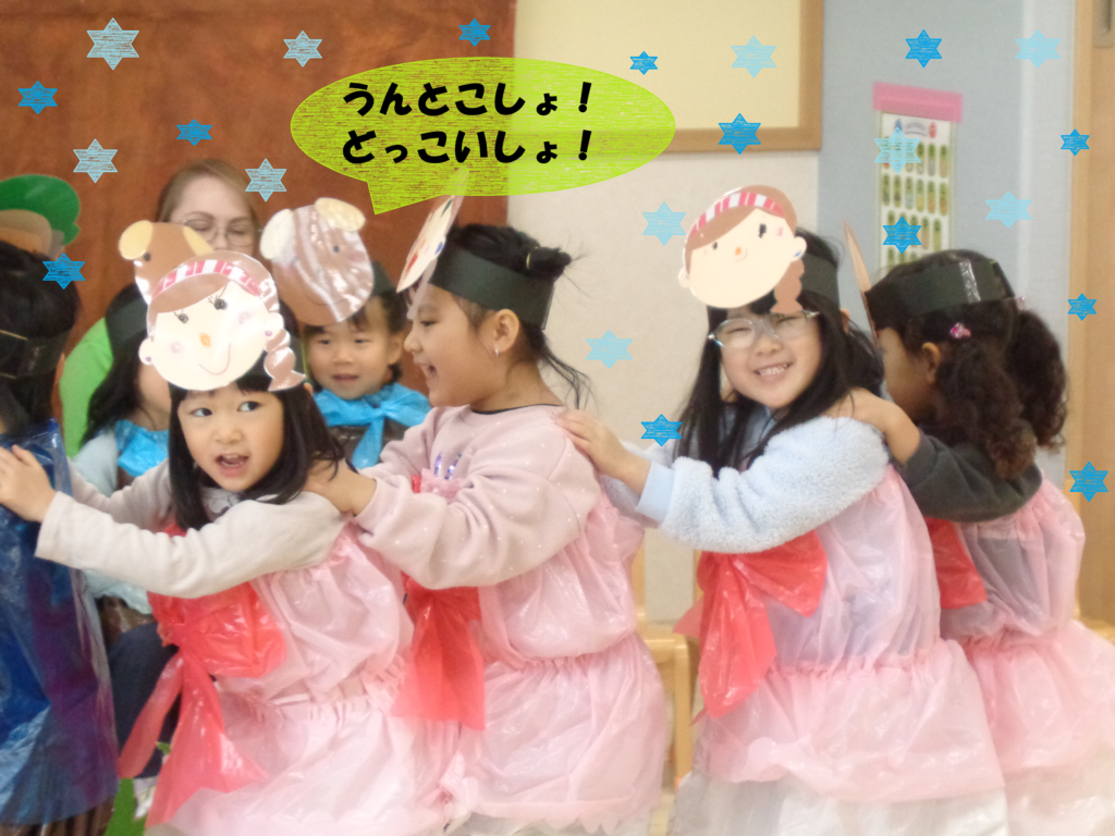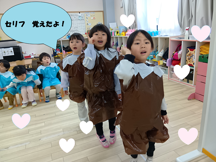 途中で台詞を忘れてしまった時には…「〇〇だよ」とお友だちが教えてくれる場面も見られました。ひとりではなく、協力してみんなで作り上げていく力が育ちますね💪