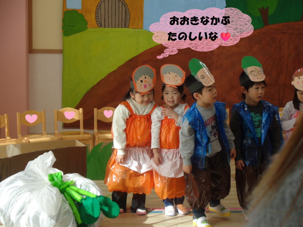 カペラ組では絵本『おおきなかぶ』の絵本で劇遊びを行いました!「この本読んだことある!」「うんとこしょどっこいしょって言うんでしょ?」など声が聞こえてきて、子どもたちに馴染みのあるお話です!