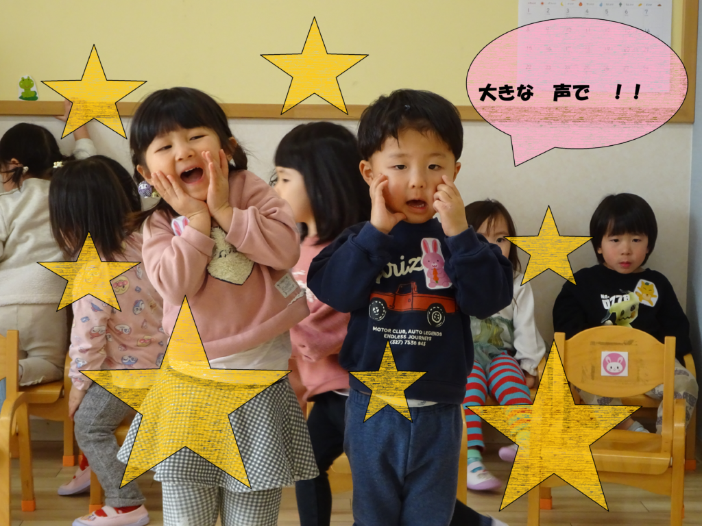 はじめは保育者が台詞を言いながら、役になりきって動作をしてみると、子ども達は「あはは😆」と大盛り上がり☆