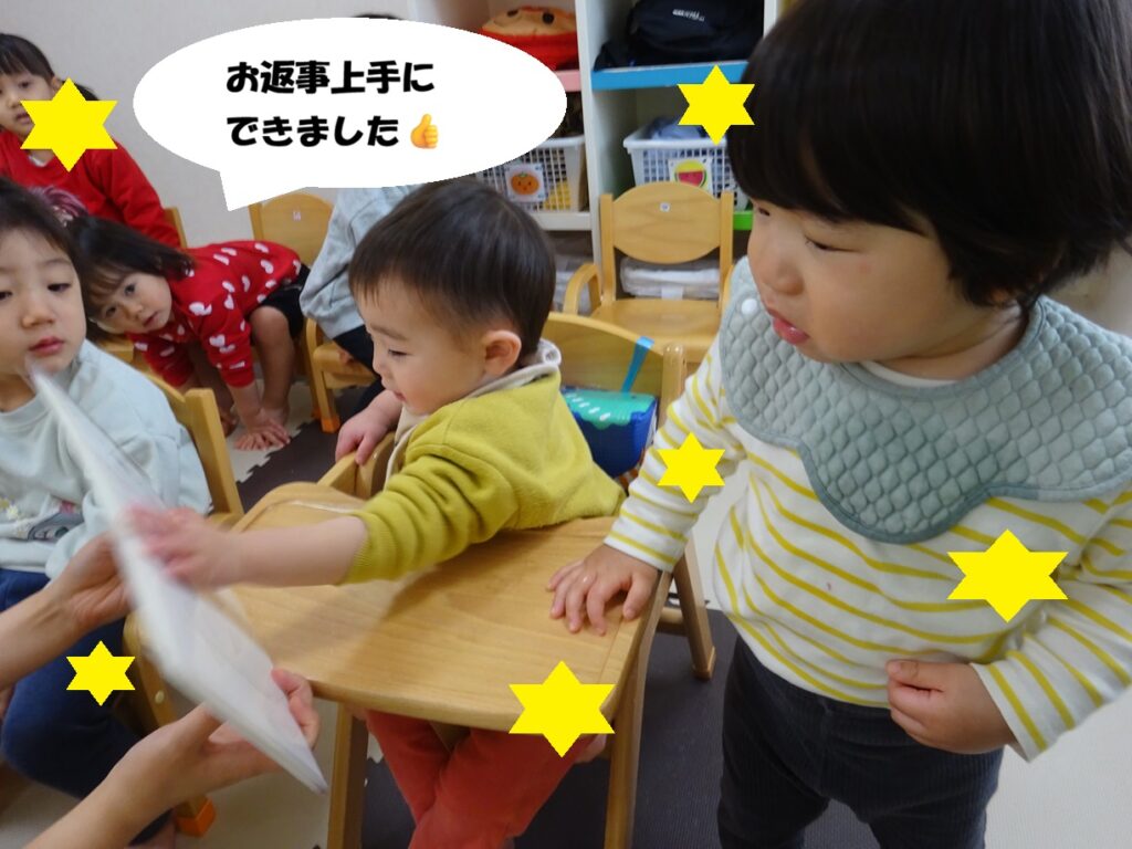 お名前呼びでは「○○くん~」と呼ばれると「はーい!」と手を挙げて返事をしたり、お名前カードにタッチしようとする姿が見られます🎵