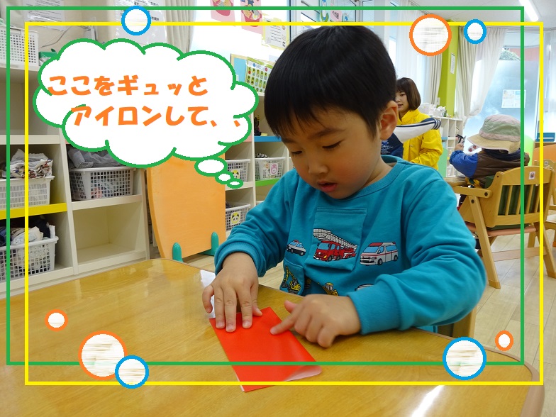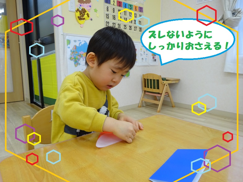 指先も上手に使えるようになり、保育士の真似をして折り紙をしたり、線繋ぎやパズルを集中して頑張ったりする姿がみられます😆