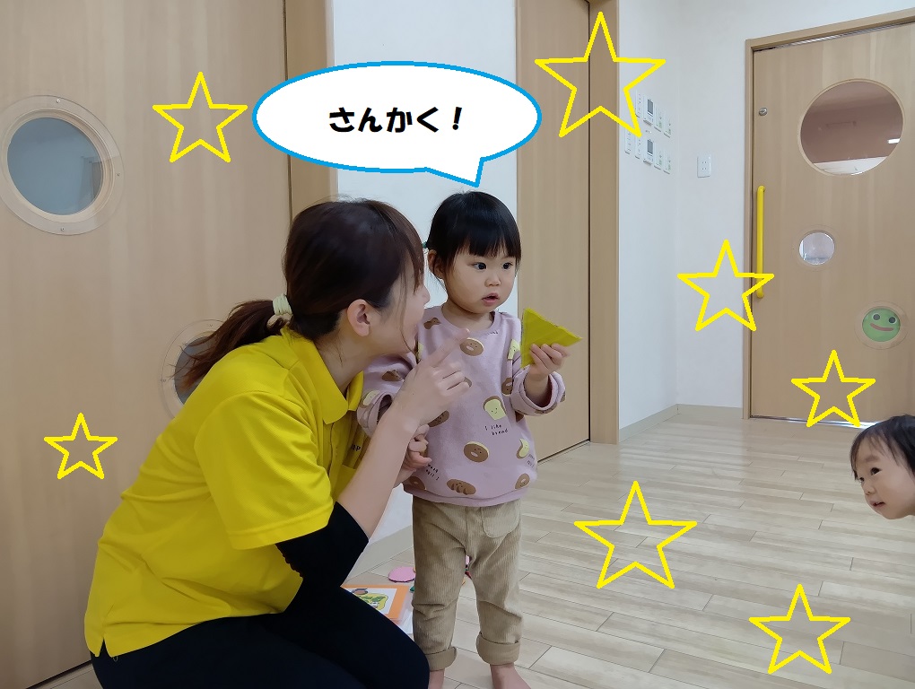 遊びの中でも形や色を見つけると、保育士に教えに来てくれたりお友だち同士で声に出したりとやり取りを楽しんでいます。