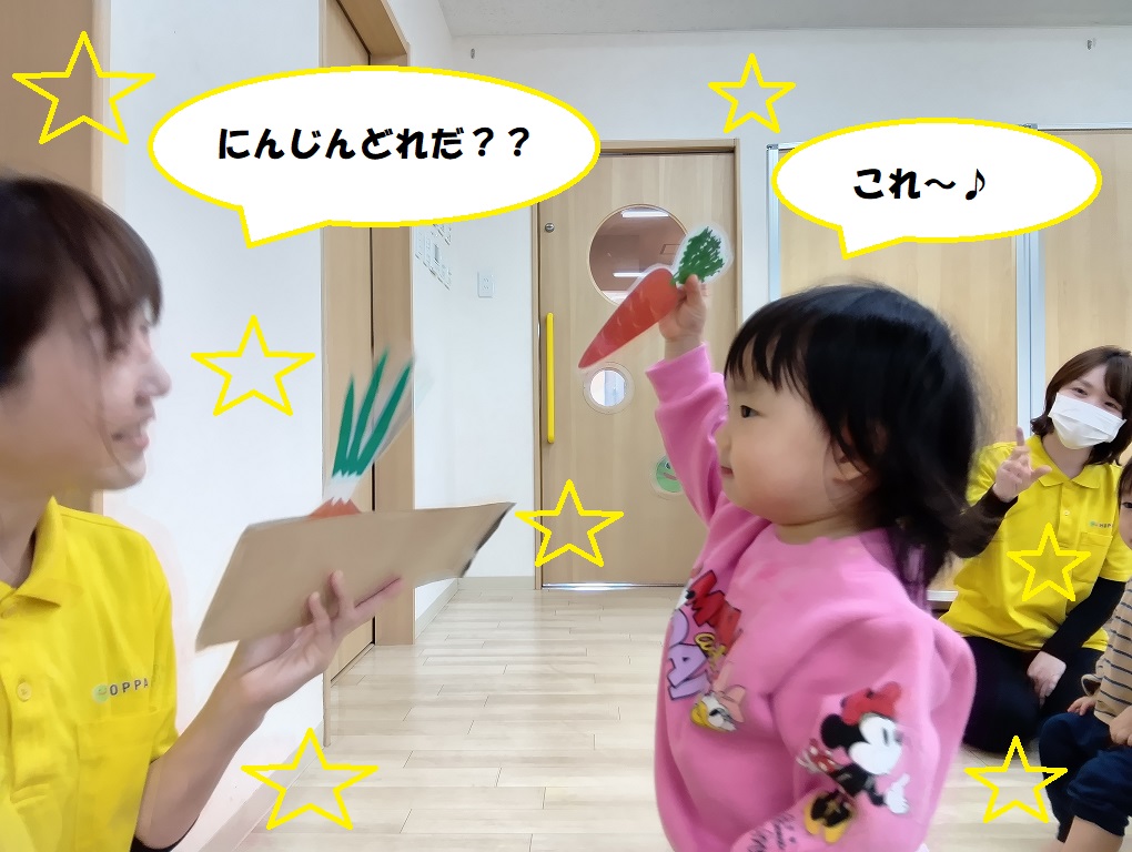 また野菜カードを見せて「にんじんどっちかな?」と聞くと「こっち!」と嬉しそうに選ぶ姿があります😊