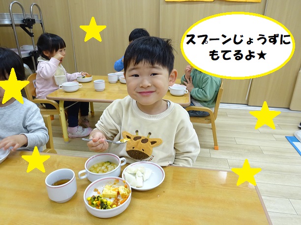 入園当初はスプーンを持つことも難しかった子どもたちですが、今ではしっかりと自分で持って給食を食べることができるようになりました✨