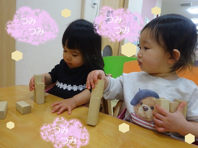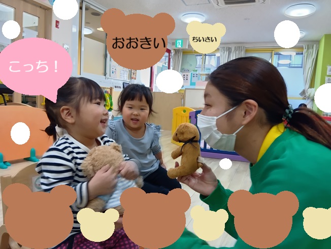 「大きい・小さい」「高い・低い」にも挑戦しており、馴染みのあるぬいぐるみや積み木を使うことで遊びの中でも「おおきい くまさん!」と大きさの違いを理解した言葉が増えてきました。