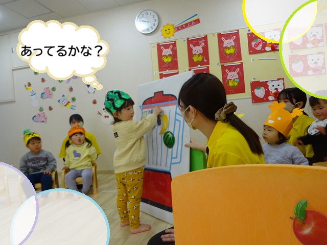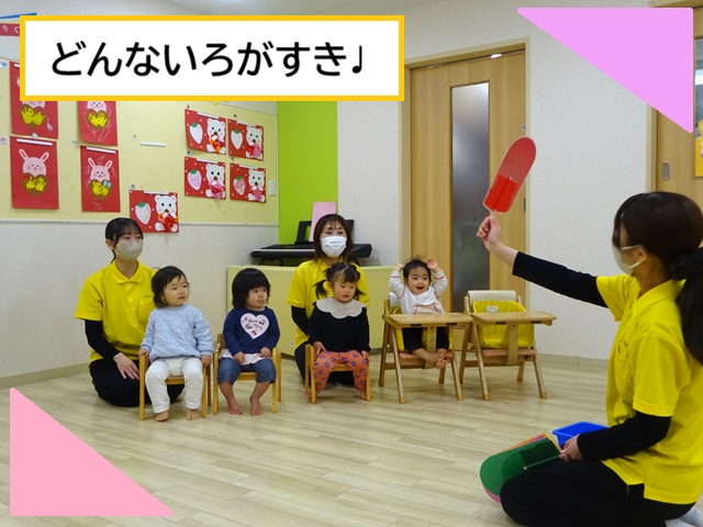 「色」をテーマに、子どもたちの大好きな「いろいろばあ」の絵本や「どんないろがすき」の歌を取り入れました♩