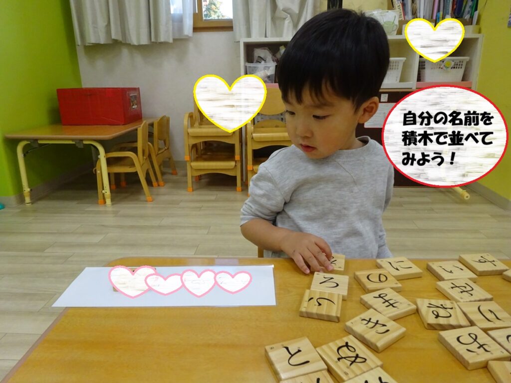 自分の名前が書いてあるカードの上にひらがな積み木を並べて、名前を完成させます。
