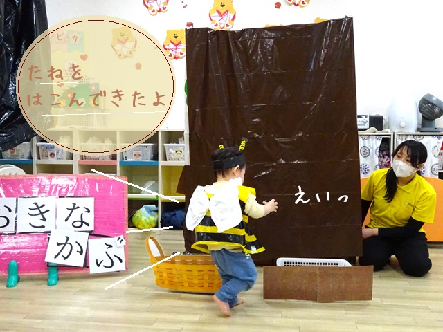スピカ組のみつばちに変身した子どもたちがかぶの種を運んできてくれました。