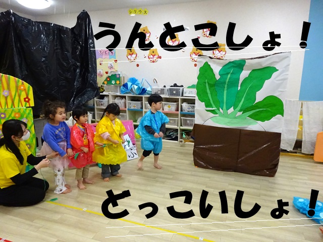 「うんとこしょ、どっこいしょ」とみんなで力を合わせてかぶを引っ張ります。
