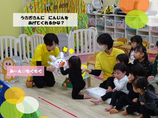 スピカ組(0歳児クラス)は、お名前呼びと食べ物の選び取りをしました。