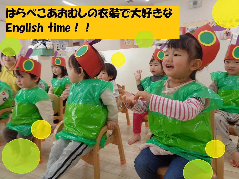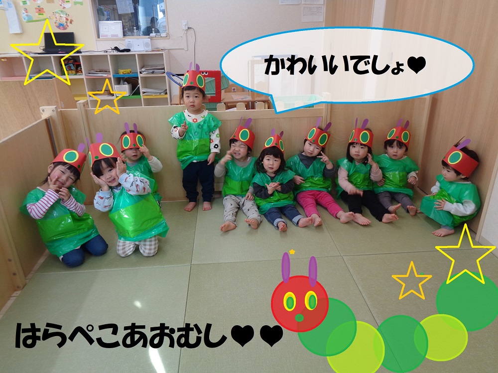 成果発表会では、子どもたちの大好きな絵本の「はらぺこあおむし」を題材にした活動をかわいい衣装を着て取り組みました!