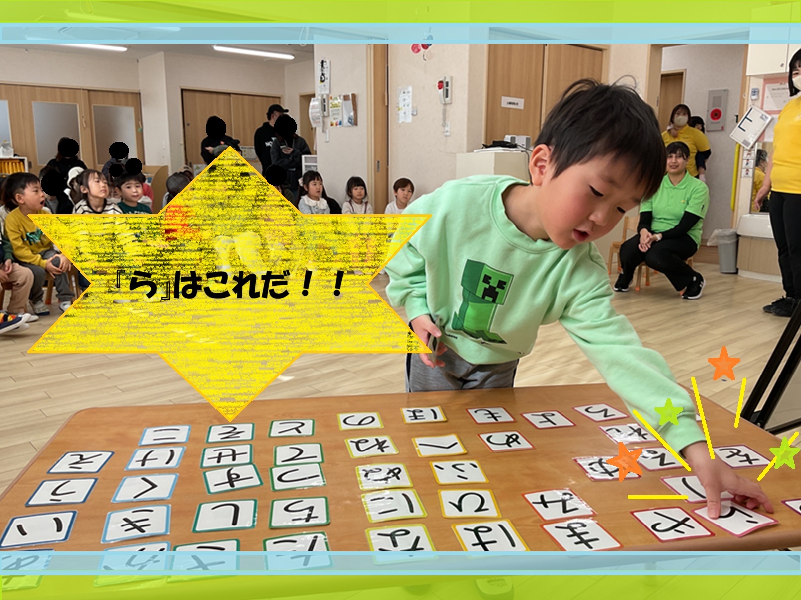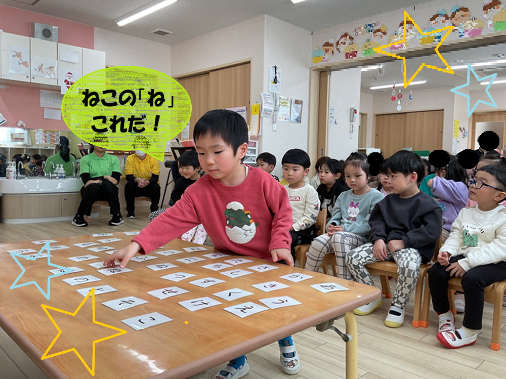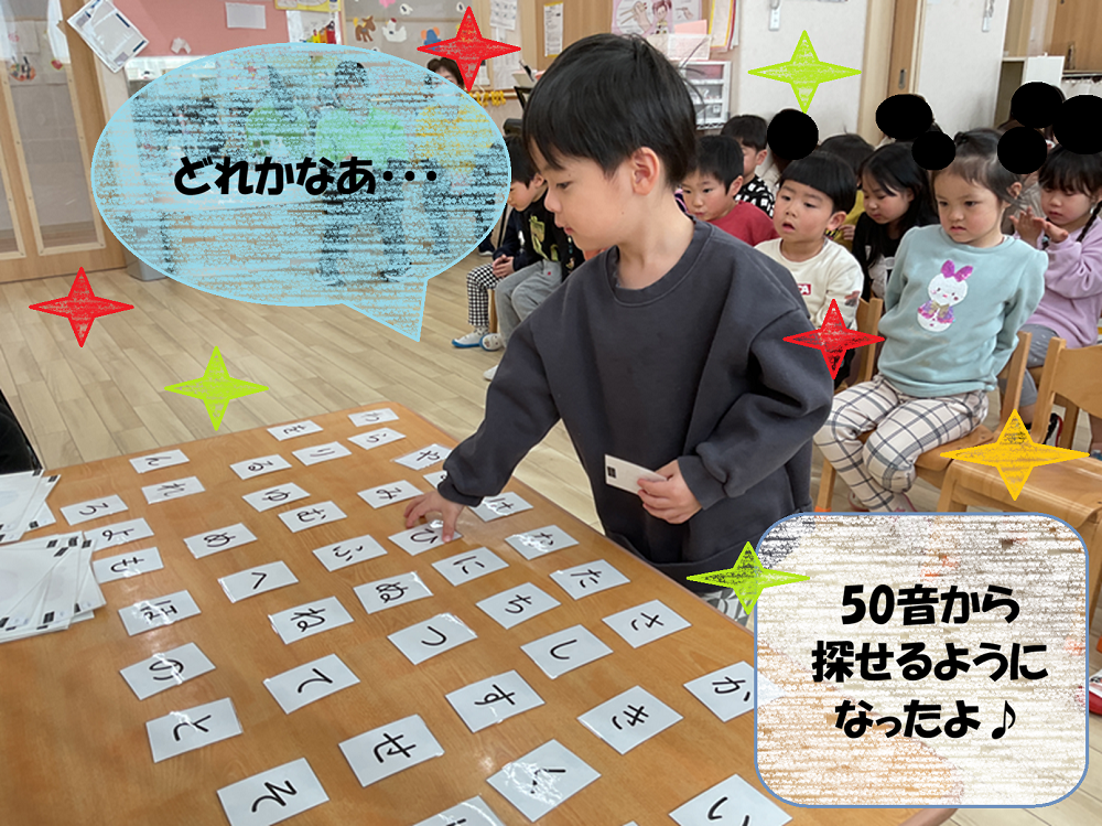 5月の参観日では動物の頭文字を何枚かのひらがなカードから探していましたが、2月の成果発表会では50音の中から動物の名前を探しました!