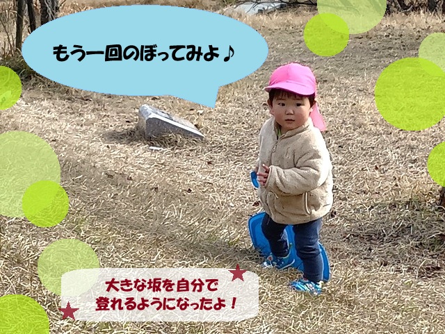 子どもたちのその日の体調や気持ちを受け止めながら、お天気の良い日は戸外に出かけ、寒さに負けない身体づくりを行っています!😏