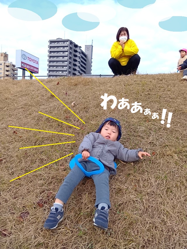 今回は、寒さを吹き飛ばすほど盛り上がっている戸外遊びの中でも、特に子どもたちが喜んで楽しんでいる『芝滑り』の様子をお伝えしたいと思います☺
